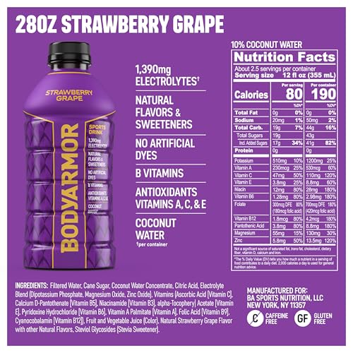 Specification: BODYARMOR Sports Drink, Strawberry Grape, Electrolyte Drink Hydration, 28 Fl Oz Bottles (15 Pack), Flavored Coconut Water with B Vitamins & Antioxidants