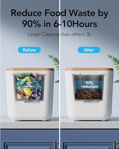 【Stylish Design and Large Capacity】 The electric composter with compact volume design (11.2*13.8*12.2″), which is perfect for your countertop without taking up too much space. And its bucket space is as large as 3L. The appearance design for the compost maker is simple and stylish, you will be surprised when you receive it